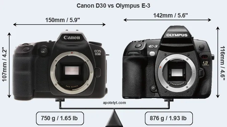 If the front view area (width x height) of the cameras is taken as an aggregate measure of their size, the Olympus E-3 is somewhat larger (3 percent) than the Canon D30. Moreover, the E-3 is markedly heavier (17 percent) than the D30. It is noteworthy in this context that the E-3 is splash and dust-proof, while the D30 does not feature any corresponding weather-sealing.