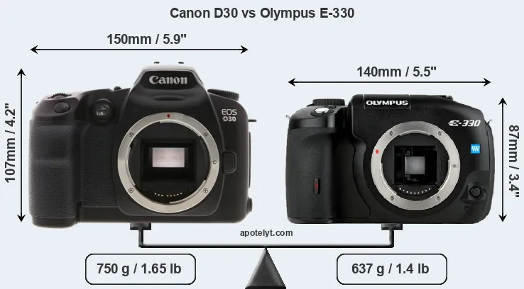 The physical size and weight of the Canon D30 and the Olympus E-330 are illustrated in the side-by-side display below. The two cameras are presented according to their relative size. Three successive views from the front, the top, and the rear are shown. All width, height and depth measures are rounded to the nearest millimeter.