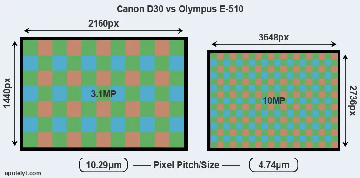 Despite having a smaller sensor, the E-510 offers a higher resolution of 10 megapixels, compared with 3.1 MP of the D30. This megapixels advantage comes at the cost of a higher pixel density and a smaller size of the individual pixel (with a pixel pitch of 4.74μm versus 10.29μm for the D30). However, it should be noted that the E-510 is much more recent (by 6 years and 9 months) than the D30, and its sensor will have benefitted from technological advances during this time that make it possible to gather light more efficiently.