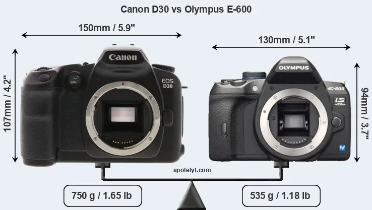 If the front view area (width x height) of the cameras is taken as an aggregate measure of their size, the Olympus E-600 is notably smaller (24 percent) than the Canon D30. Moreover, the E-600 is markedly lighter (29 percent) than the D30. In this context, it is worth noting that neither the D30 nor the E-600 are weather-sealed.