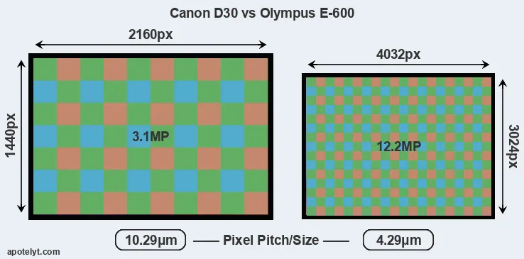 Despite having a smaller sensor, the E-600 offers a higher resolution of 12.2 megapixels, compared with 3.1 MP of the D30. This megapixels advantage comes at the cost of a higher pixel density and a smaller size of the individual pixel (with a pixel pitch of 4.29μm versus 10.29μm for the D30). However, it should be noted that the E-600 is much more recent (by 9 years and 3 months) than the D30, and its sensor will have benefitted from technological advances during this time that make it possible to gather light more efficiently.