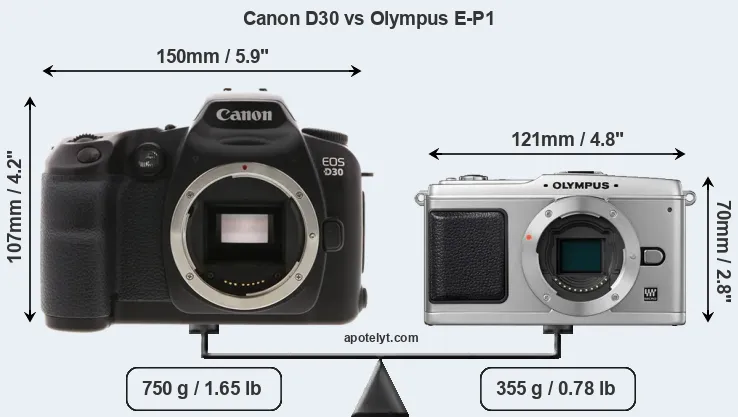 If the front view area (width x height) of the cameras is taken as an aggregate measure of their size, the Olympus E-P1 is considerably smaller (47 percent) than the Canon D30. Moreover, the E-P1 is substantially lighter (53 percent) than the D30. In this context, it is worth noting that neither the D30 nor the E-P1 are weather-sealed.