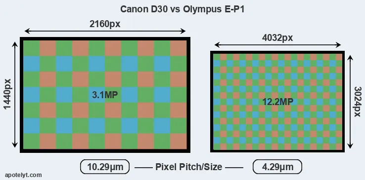 Despite having a smaller sensor, the E-P1 offers a higher resolution of 12.2 megapixels, compared with 3.1 MP of the D30. This megapixels advantage comes at the cost of a higher pixel density and a smaller size of the individual pixel (with a pixel pitch of 4.29μm versus 10.29μm for the D30). However, it should be noted that the E-P1 is much more recent (by 9 years and 1 month) than the D30, and its sensor will have benefitted from technological advances during this time that make it possible to gather light more efficiently.