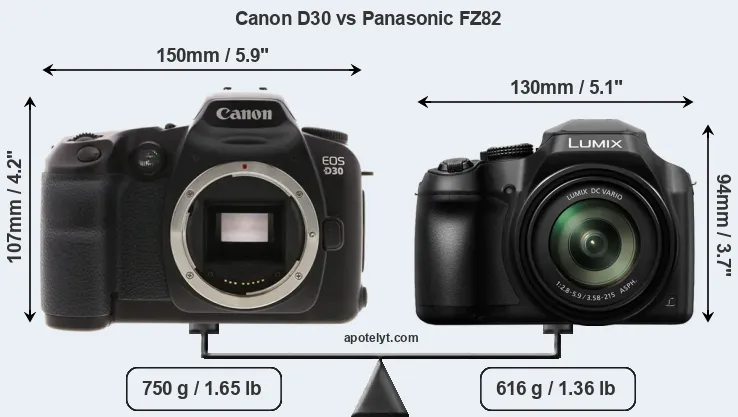 An illustration of the physical size and weight of the Canon D30 and the Panasonic FZ82 is provided in the side-by-side display below. The two cameras are presented according to their relative size. Three consecutive views from the front, the top, and the rear side are shown. All width, height and depth measures are rounded to the nearest millimeter.