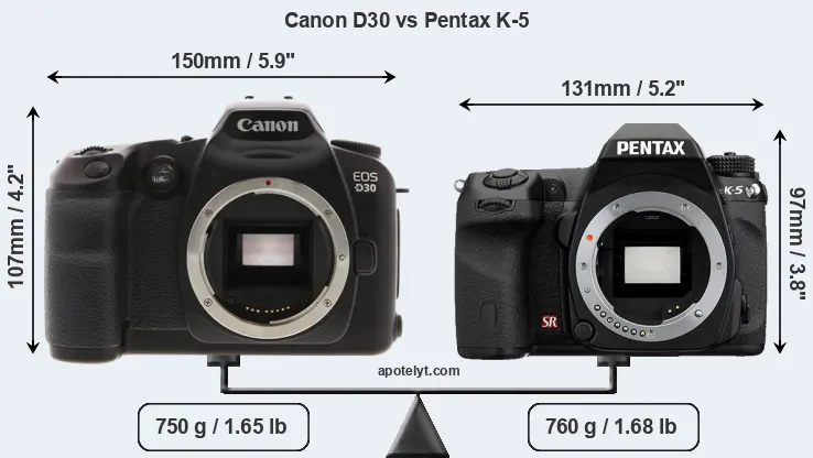The side-by-side display below illustrates the physical size and weight of the Canon D30 and the Pentax K-5. The two cameras are presented according to their relative size. Three consecutive perspectives from the front, the top, and the back are available. All width, height and depth dimensions are rounded to the nearest millimeter.