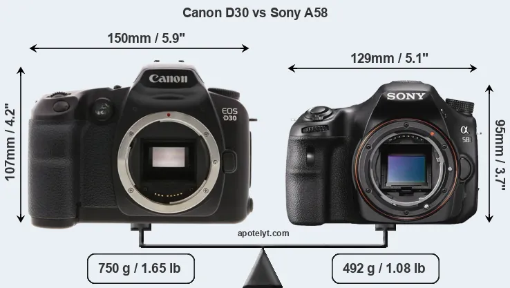The physical size and weight of the Canon D30 and the Sony A58 are illustrated in the side-by-side display below. The two cameras are presented according to their relative size. Three consecutive views from the front, the top, and the rear side are shown. All width, height and depth dimensions are rounded to the nearest millimeter.