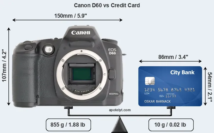 An illustration of the physical dimensions of the Canon D60 vis-à-vis a credit card is provided in the side-by-side display below. Three consecutive perspectives from the front, the top, and the back are presented. All size dimensions are rounded to the nearest millimeter.