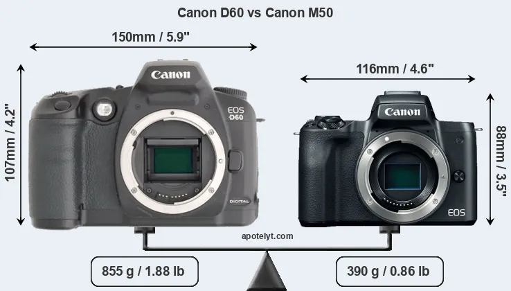 The side-by-side display below illustrates the physical size and weight of the Canon D60 and the Canon M50. The two cameras are presented according to their relative size. Three successive views from the front, the top, and the rear are shown. All width, height and depth measures are rounded to the nearest millimeter.