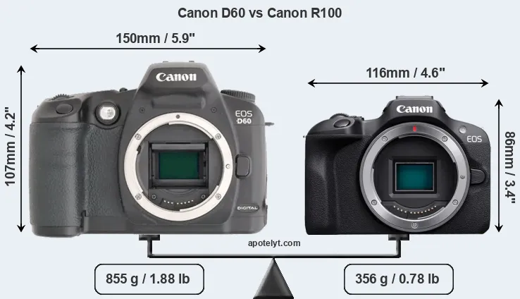 An illustration of the physical size and weight of the Canon D60 and the Canon R100 is provided in the side-by-side display below. The two cameras are presented according to their relative size. Three consecutive perspectives from the front, the top, and the back are available. All size dimensions are rounded to the nearest millimeter.