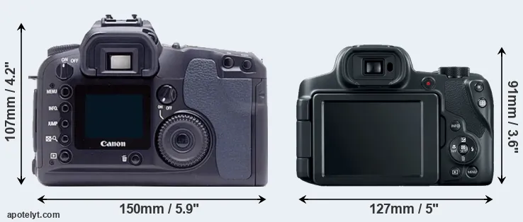 The side-by-side display below illustrates the physical size and weight of the Canon D60 and the Canon SX70. The two cameras are presented according to their relative size. Three successive views from the front, the top, and the rear are shown. All width, height and depth measures are rounded to the nearest millimeter.