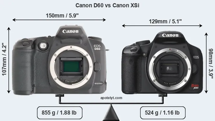 The side-by-side display below illustrates the physical size and weight of the Canon D60 and the Canon XSi. The two cameras are presented according to their relative size. Three consecutive views from the front, the top, and the rear side are shown. All size dimensions are rounded to the nearest millimeter.