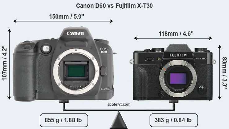 The side-by-side display below illustrates the physical size and weight of the Canon D60 and the Fujifilm X-T30. The two cameras are presented according to their relative size. Three successive views from the front, the top, and the rear are shown. All width, height and depth measures are rounded to the nearest millimeter.