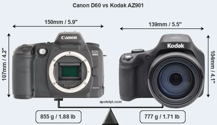 The side-by-side display below illustrates the physical size and weight of the Canon D60 and the Kodak AZ901. The two cameras are presented according to their relative size. Three consecutive views from the front, the top, and the rear side are shown. All size dimensions are rounded to the nearest millimeter.