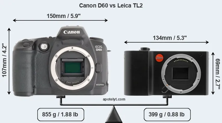 The physical size and weight of the Canon D60 and the Leica TL2 are illustrated in the side-by-side display below. The two cameras are presented according to their relative size. Three successive views from the front, the top, and the rear are shown. All size dimensions are rounded to the nearest millimeter.