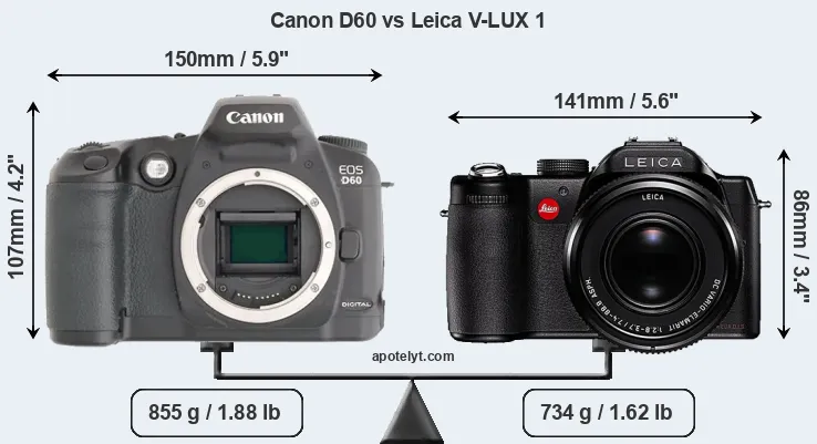 An illustration of the physical size and weight of the Canon D60 and the Leica V-LUX 1 is provided in the side-by-side display below. The two cameras are presented according to their relative size. Three consecutive perspectives from the front, the top, and the back are available. All width, height and depth dimensions are rounded to the nearest millimeter.