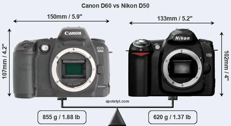 The side-by-side display below illustrates the physical size and weight of the Canon D60 and the Nikon D50. The two cameras are presented according to their relative size. Three successive views from the front, the top, and the rear are shown. All size dimensions are rounded to the nearest millimeter.
