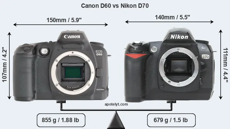 An illustration of the physical size and weight of the Canon D60 and the Nikon D70 is provided in the side-by-side display below. The two cameras are presented according to their relative size. Three consecutive views from the front, the top, and the rear side are shown. All width, height and depth dimensions are rounded to the nearest millimeter.