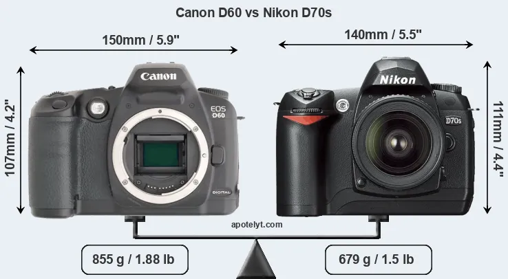 An illustration of the physical size and weight of the Canon D60 and the Nikon D70s is provided in the side-by-side display below. The two cameras are presented according to their relative size. Three consecutive views from the front, the top, and the rear side are shown. All width, height and depth dimensions are rounded to the nearest millimeter.