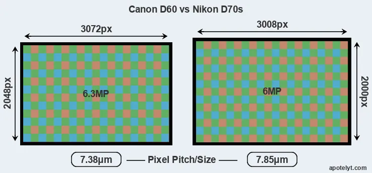 Despite having a smaller sensor, the Canon D60 offers a higher resolution of 6.3 megapixels, compared with 6 MP of the Nikon D70s. This megapixels advantage comes at the cost of a higher pixel density and a smaller size of the individual pixel (with a pixel pitch of 7.38μm versus 7.85μm for the D70s). Moreover, it should be noted that the D70s is much more recent (by 3 years and 1 month) than the D60, and its sensor will have benefitted from technological advances during this time that further enhance the light gathering capacity of its pixel-units.