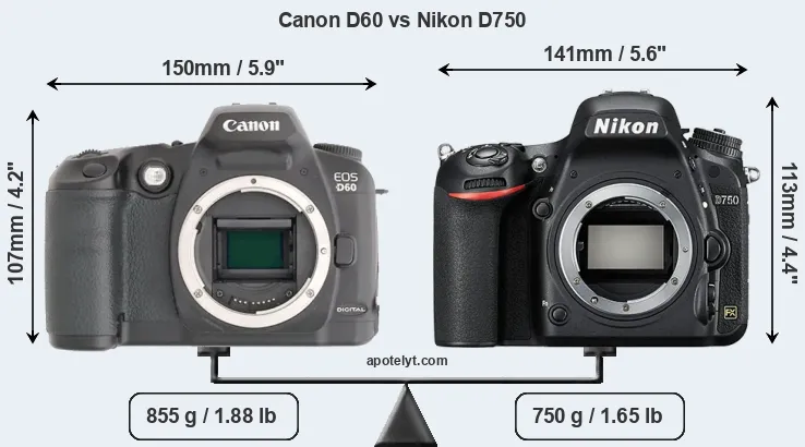An illustration of the physical size and weight of the Canon D60 and the Nikon D750 is provided in the side-by-side display below. The two cameras are presented according to their relative size. Three consecutive views from the front, the top, and the rear side are shown. All width, height and depth dimensions are rounded to the nearest millimeter.