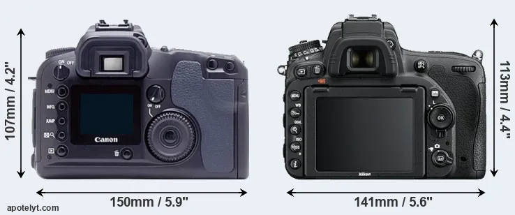 If the front view area (width x height) of the cameras is taken as an aggregate measure of their size, the Canon D60 and the Nikon D750 are of equal size. However, the D750 is markedly lighter (12 percent) than the D60. It is noteworthy in this context that the D750 is splash and dust-proof, while the D60 does not feature any corresponding weather-sealing.