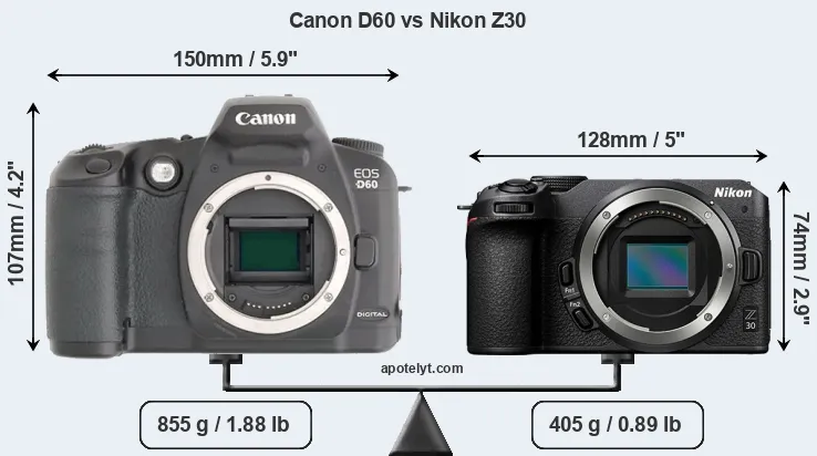 An illustration of the physical size and weight of the Canon D60 and the Nikon Z30 is provided in the side-by-side display below. The two cameras are presented according to their relative size. Three consecutive perspectives from the front, the top, and the back are available. All size dimensions are rounded to the nearest millimeter.