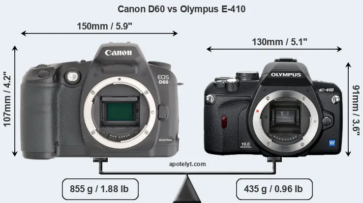 The side-by-side display below illustrates the physical size and weight of the Canon D60 and the Olympus E-410. The two cameras are presented according to their relative size. Three consecutive views from the front, the top, and the rear side are shown. All size dimensions are rounded to the nearest millimeter.