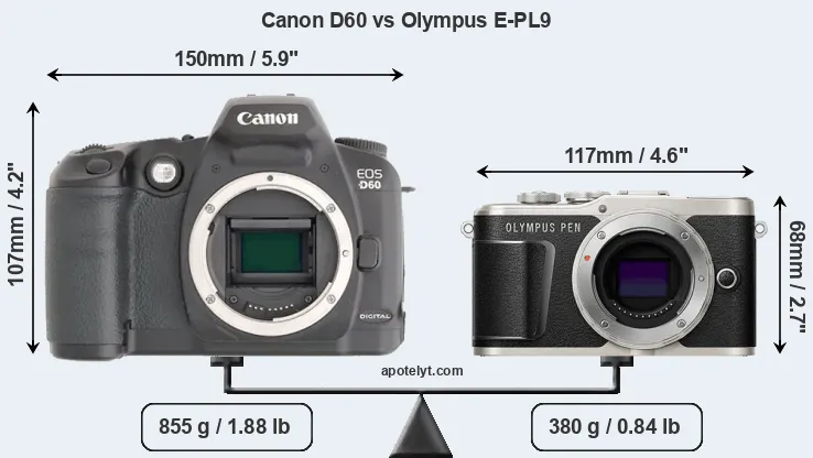 If the front view area (width x height) of the cameras is taken as an aggregate measure of their size, the Olympus E-PL9 is considerably smaller (50 percent) than the Canon D60. Moreover, the E-PL9 is substantially lighter (56 percent) than the D60. In this context, it is worth noting that neither the D60 nor the E-PL9 are weather-sealed.