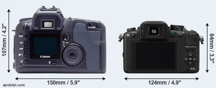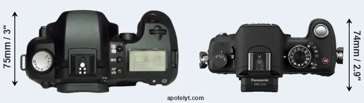 The side-by-side display below illustrates the physical size and weight of the Canon D60 and the Panasonic G10. The two cameras are presented according to their relative size. Three consecutive perspectives from the front, the top, and the back are available. All size dimensions are rounded to the nearest millimeter.