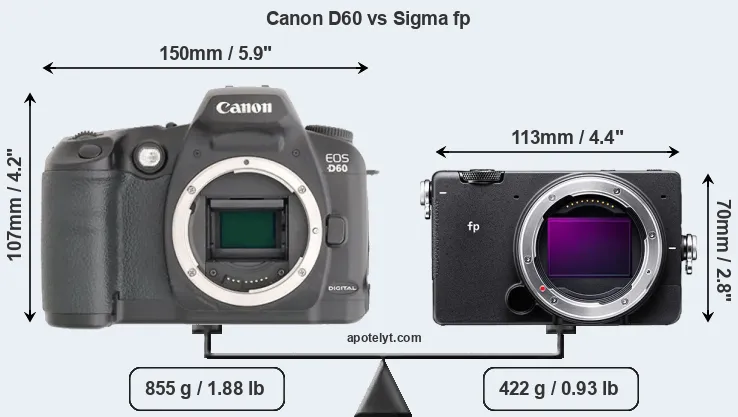 Going beyond this snapshot of core features and characteristics, what are the differences between the Canon EOS-D60 and the Sigma fp? Which one should you buy? Read on to find out how these two cameras compare with respect to their body size, their imaging sensors, their shooting features, their input-output connections, and their reception by expert reviewers.