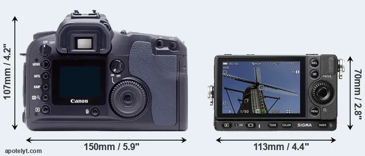 The side-by-side display below illustrates the physical size and weight of the Canon D60 and the Sigma fp. The two cameras are presented according to their relative size. Three consecutive views from the front, the top, and the rear side are shown. All width, height and depth dimensions are rounded to the nearest millimeter.
