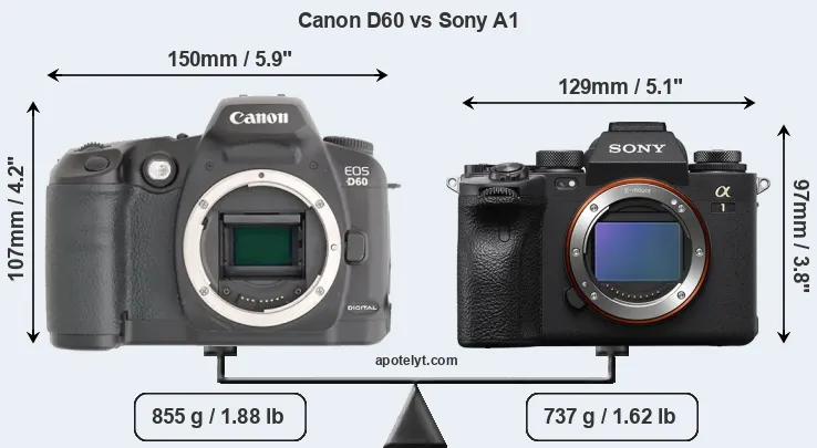 An illustration of the physical size and weight of the Canon D60 and the Sony A1 is provided in the side-by-side display below. The two cameras are presented according to their relative size. Three consecutive views from the front, the top, and the rear side are shown. All width, height and depth dimensions are rounded to the nearest millimeter.