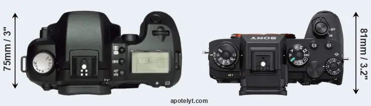 If the front view area (width x height) of the cameras is taken as an aggregate measure of their size, the Sony A1 is notably smaller (22 percent) than the Canon D60. Moreover, the A1 is markedly lighter (14 percent) than the D60. It is noteworthy in this context that the A1 is splash and dust-proof, while the D60 does not feature any corresponding weather-sealing.