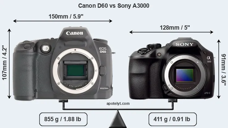 The side-by-side display below illustrates the physical size and weight of the Canon D60 and the Sony A3000. The two cameras are presented according to their relative size. Three successive views from the front, the top, and the rear are shown. All width, height and depth measures are rounded to the nearest millimeter.