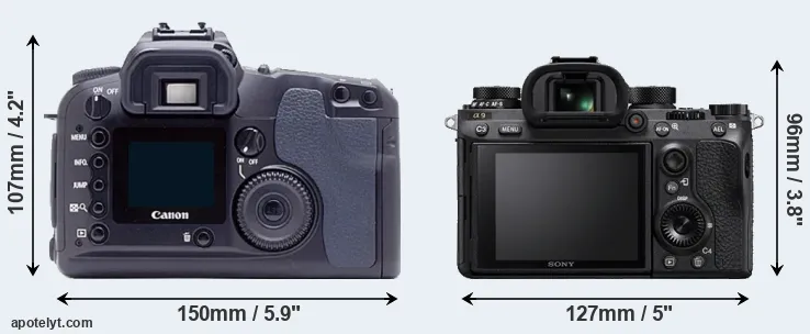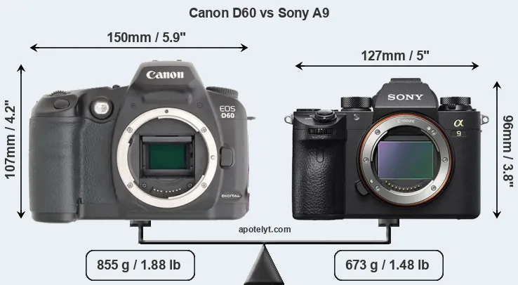 An illustration of the physical size and weight of the Canon D60 and the Sony A9 is provided in the side-by-side display below. The two cameras are presented according to their relative size. Three consecutive perspectives from the front, the top, and the back are available. All width, height and depth measures are rounded to the nearest millimeter.