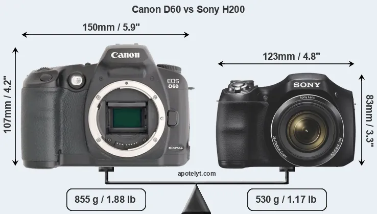An illustration of the physical size and weight of the Canon D60 and the Sony H200 is provided in the side-by-side display below. The two cameras are presented according to their relative size. Three consecutive perspectives from the front, the top, and the back are available. All width, height and depth measures are rounded to the nearest millimeter.