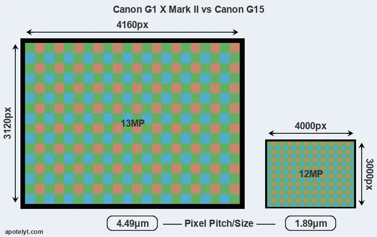 With 13MP, the G1X Mark II offers a slightly higher resolution than the G15 (12MP), but the G1X Mark II nevertheless has larger individual pixels (pixel pitch of 4.49μm versus 1.89μm for the G15) due to its larger sensor. Moreover, the G1X Mark II is a somewhat more recent model (by 1 year and 4 months) than the G15, and its sensor might have benefitted from technological advances during this time that further enhance the light gathering capacity of its pixels.