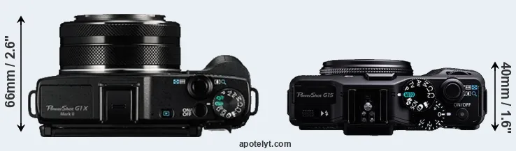 The side-by-side display below illustrates the physical size and weight of the Canon G1 X Mark II and the Canon G15. The two cameras are presented according to their relative size. Three successive views from the front, the top, and the rear are shown. All width, height and depth dimensions are rounded to the nearest millimeter.