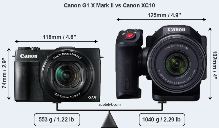 The side-by-side display below illustrates the physical size and weight of the Canon G1 X Mark II and the Canon XC10. The two cameras are presented according to their relative size. Three consecutive perspectives from the front, the top, and the back are available. All width, height and depth measures are rounded to the nearest millimeter.