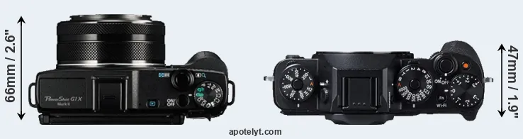 If the front view area (width x height) of the cameras is taken as an aggregate measure of their size, the Fujifilm X-T1 is notably larger (35 percent) than the Canon G1 X Mark II. It is noteworthy in this context that the X-T1 is splash and dust-proof, while the G1X Mark II does not feature any corresponding weather-sealing.