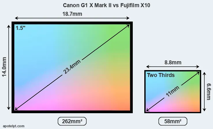 Of the two cameras under consideration, the Canon G1 X Mark II features an 1.5-inch sensor and the Fujifilm X10 a 2/3 sensor. The sensor area in the X10 is 78 percent smaller. As a result of these sensor size differences, the cameras have a format factor of, respectively, 1.85 and 3.9. Both cameras feature a native aspect ratio (sensor width to sensor height) of 4:3.