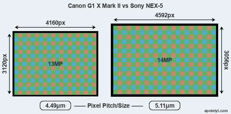With 14MP, the NEX-5 offers a higher resolution than the G1X Mark II (13MP), but the NEX-5 nevertheless has larger individual pixels (pixel pitch of 5.11μm versus 4.49μm for the G1X Mark II) due to its larger sensor. However, the G1X Mark II is a much more recent model (by 3 years and 9 months) than the NEX-5, and its sensor will have benefitted from technological advances during this time that enhance the light gathering capacity of its pixel-units.