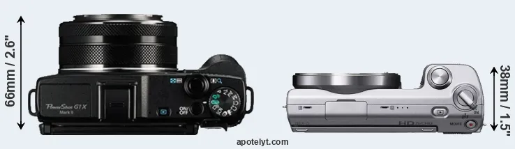 If the front view area (width x height) of the cameras is taken as an aggregate measure of their size, the Sony NEX-5 is notably smaller (24 percent) than the Canon G1 X Mark II. In this context, it is worth noting that neither the G1X Mark II nor the NEX-5 are weather-sealed.