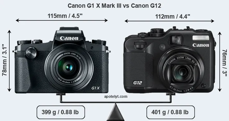 The physical size and weight of the Canon G1 X Mark III and the Canon G12 are illustrated in the side-by-side display below. The two cameras are presented according to their relative size. Three successive views from the front, the top, and the rear are shown. All width, height and depth dimensions are rounded to the nearest millimeter.