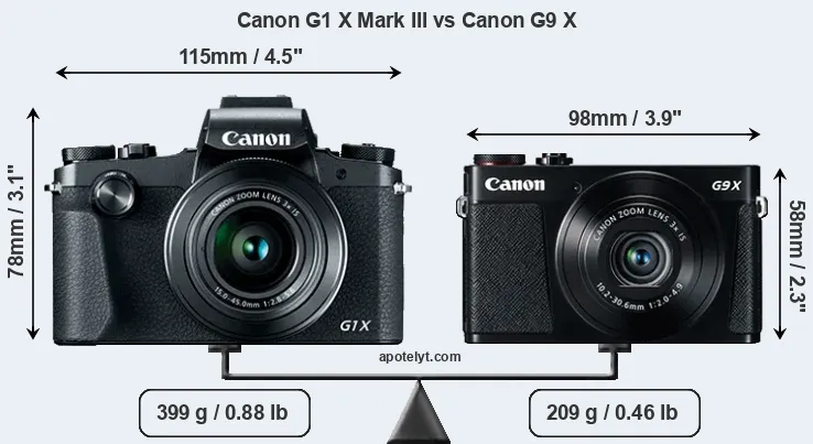 If the front view area (width x height) of the cameras is taken as an aggregate measure of their size, the Canon G9 X is considerably smaller (37 percent) than the Canon G1 X Mark III. Moreover, the G9X is substantially lighter (48 percent) than the G1X Mark III. It is worth mentioning in this context that the G1X Mark III is splash and dust resistant, while the G9X does not feature any corresponding weather-sealing.