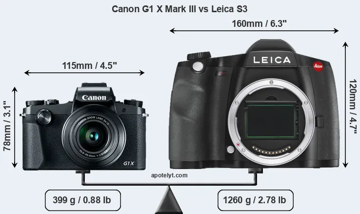 The side-by-side display below illustrates the physical size and weight of the Canon G1 X Mark III and the Leica S3. The two cameras are presented according to their relative size. Three consecutive perspectives from the front, the top, and the back are available. All width, height and depth measures are rounded to the nearest millimeter.