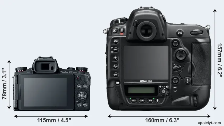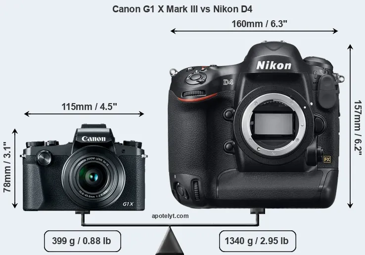 The side-by-side display below illustrates the physical size and weight of the Canon G1 X Mark III and the Nikon D4. The two cameras are presented according to their relative size. Three consecutive perspectives from the front, the top, and the back are available. All size dimensions are rounded to the nearest millimeter.