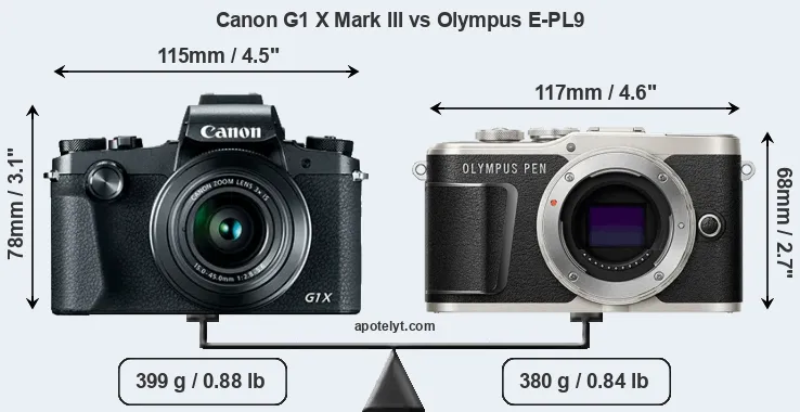 An illustration of the physical size and weight of the Canon G1 X Mark III and the Olympus E-PL9 is provided in the side-by-side display below. The two cameras are presented according to their relative size. Three successive views from the front, the top, and the rear are shown. All width, height and depth dimensions are rounded to the nearest millimeter.