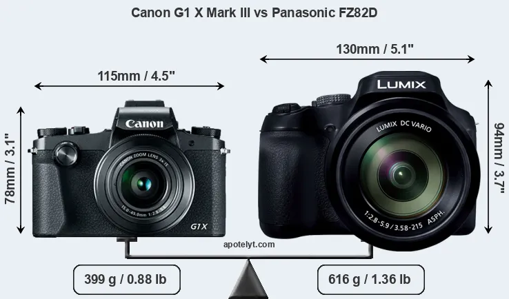 The side-by-side display below illustrates the physical size and weight of the Canon G1 X Mark III and the Panasonic FZ82D. The two cameras are presented according to their relative size. Three successive views from the front, the top, and the rear are shown. All width, height and depth measures are rounded to the nearest millimeter.