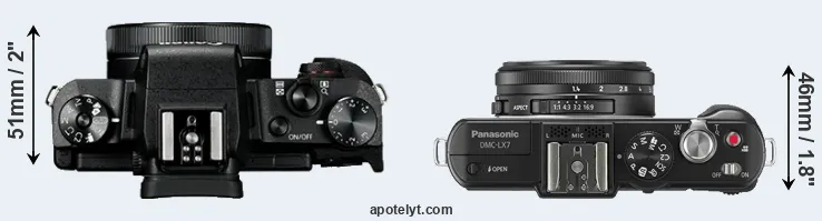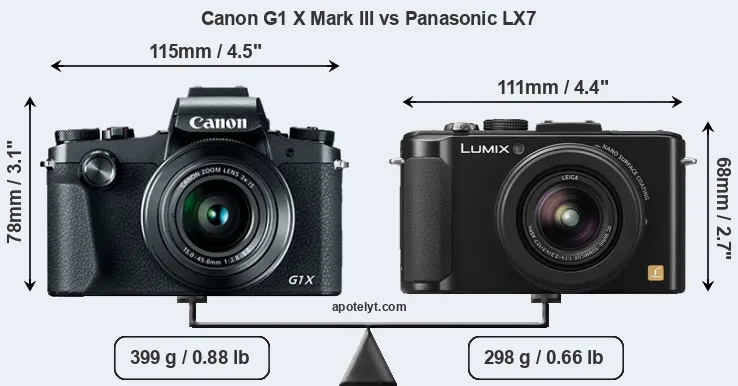 The side-by-side display below illustrates the physical size and weight of the Canon G1 X Mark III and the Panasonic LX7. The two cameras are presented according to their relative size. Three consecutive perspectives from the front, the top, and the back are available. All width, height and depth dimensions are rounded to the nearest millimeter.